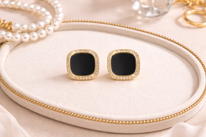 Sleek black square studs framed with a subtle sparkle for a modern, elegant look.
